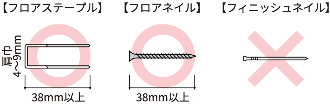 フロア固定用の釘は必ずフロアステープルまたはフロアネイルをご使用ください。