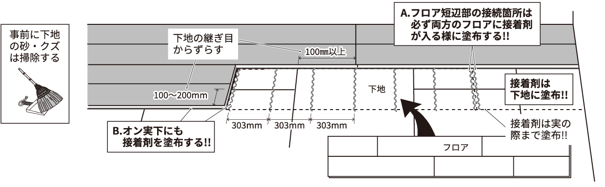 ※接着剤は湿気で固まりますので、水拭きはしないでください。所定通り接着剤を塗布しないと、目すきや床鳴り(踏み鳴り)の原因となります。