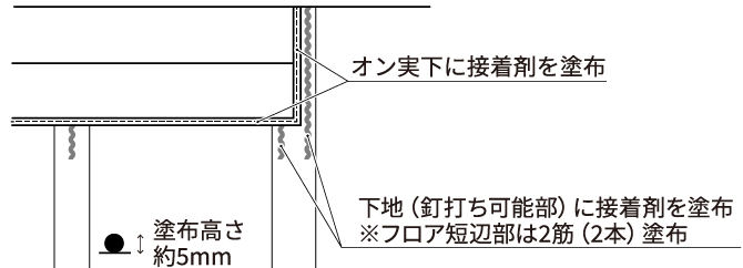 ・フロア短辺部のオン実下に接着剤を塗布