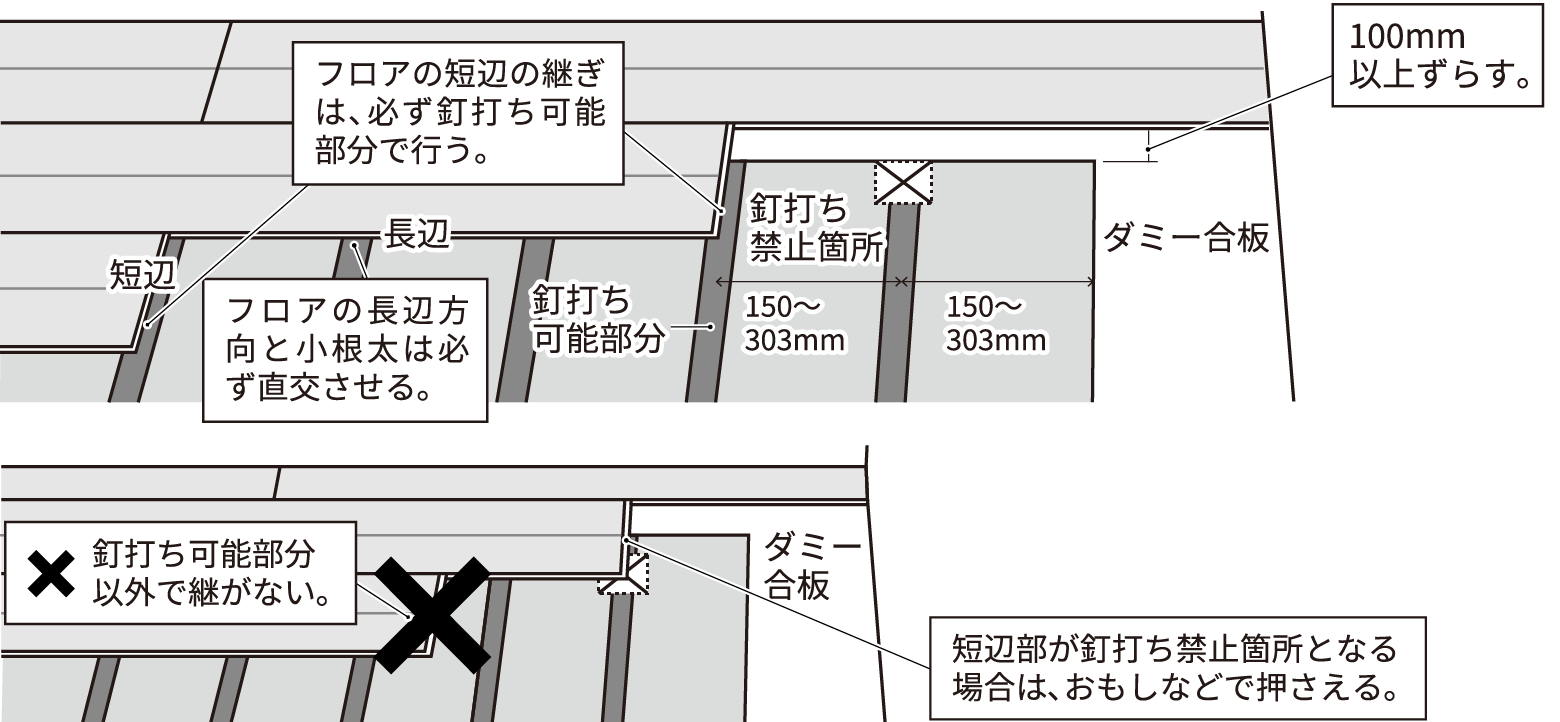 フロアの接続箇所と下地の接続箇所は100mm以上離れるように割り付けてください。